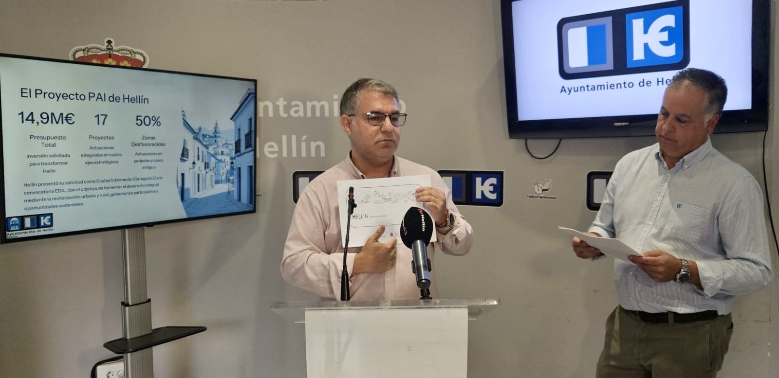 El alcalde de Hellín, Manuel Serena, acompañado por el concejal de Proyectos Europeos, Pedro García, ha comparecido esta mañana ante los medios de comunicación para responder a las declaraciones realizadas por el grupo municipal socialista en relación con la convocatoria de ayudas del programa EDUSI-SEDES (SEDES-FEDER).