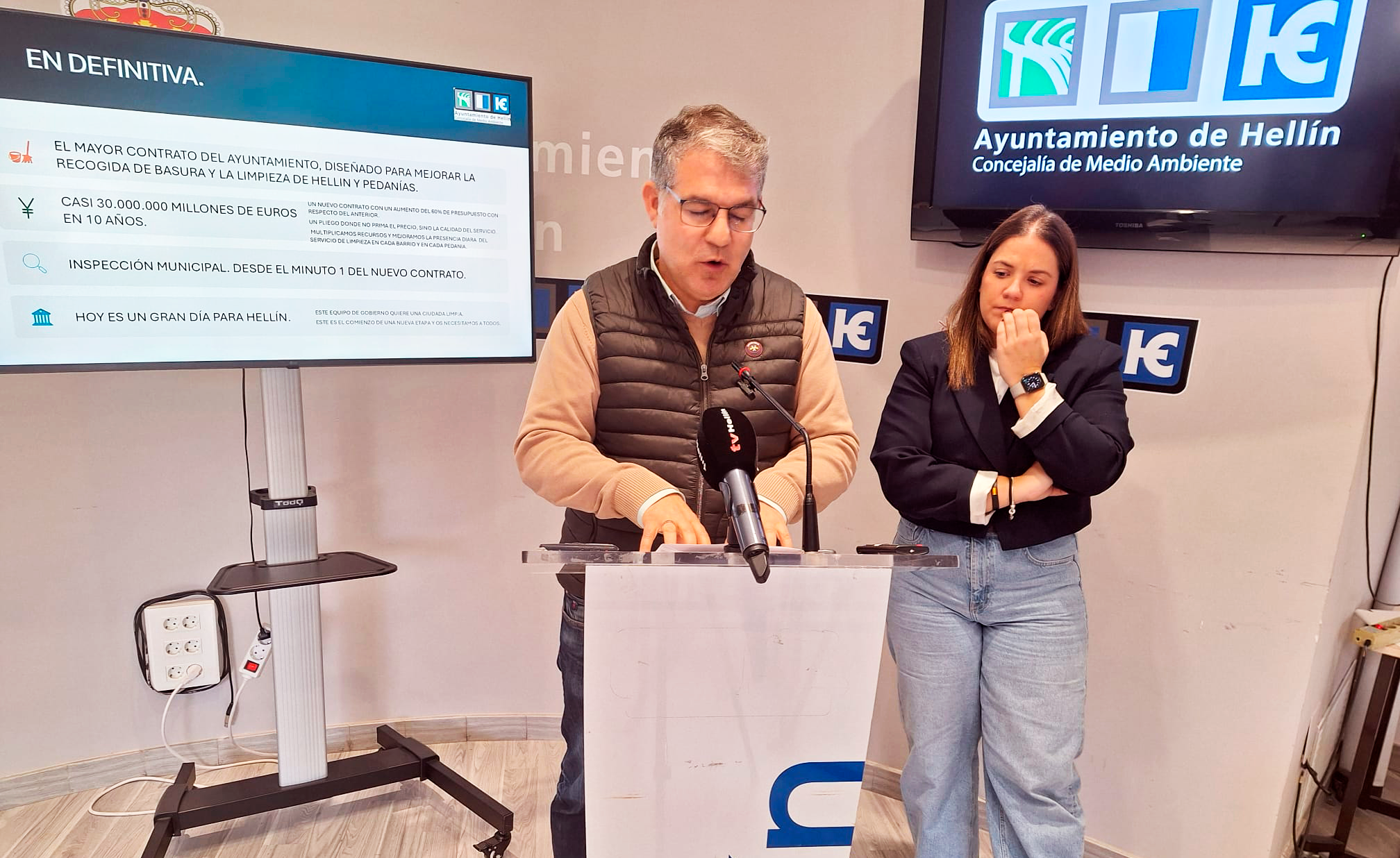 El Ayuntamiento de Hellín iniciará este jueves el proceso de licitación del nuevo contrato de recogida de residuos sólidos urbanos y limpieza viaria, una actuación que se convertirá en la mayor inversión municipal realizada hasta la fecha. Así lo han anunciado el alcalde, Manuel Serena, y la concejal de Medio Ambiente, Miriam García, durante la presentación de un servicio que pretende transformar de manera integral la limpieza del municipio.