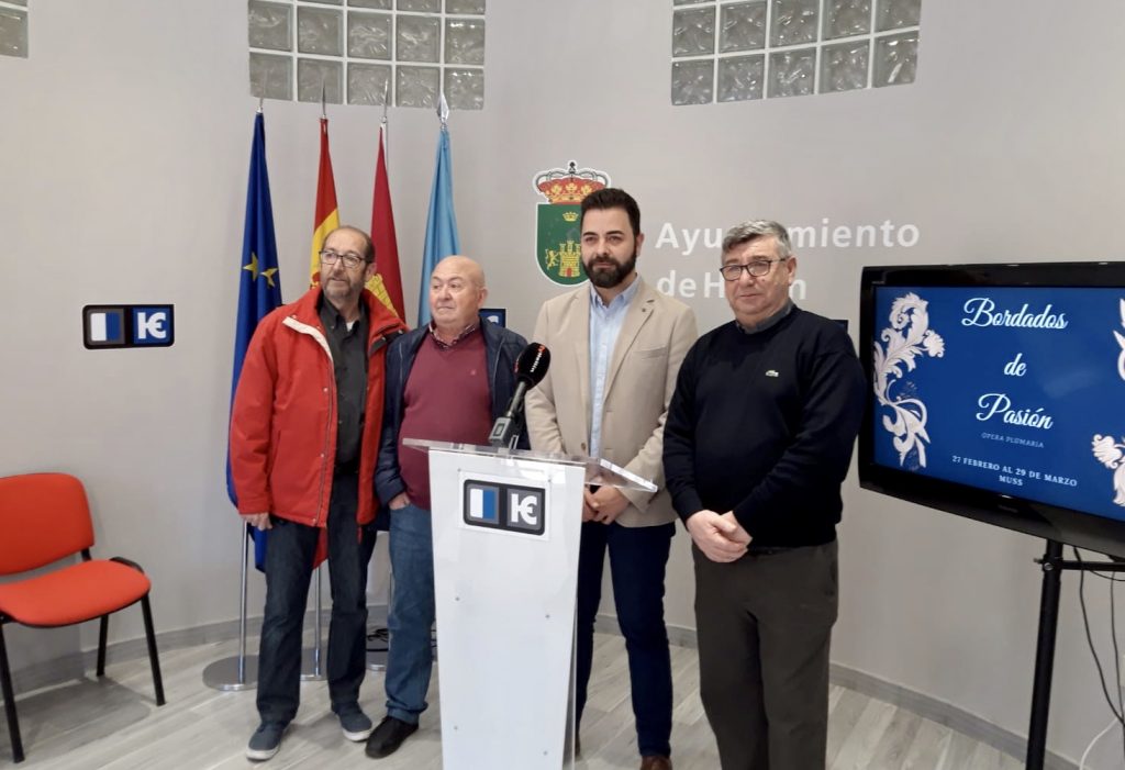 El concejal Emilio J. Pinar, llegó a la sala de prensa acompañado por representantes de las distintas cofradías y hermandades para dar cuenta de la exposición que va llevar a cabo en el Museo de Semana Santa con el título de “Bordados de Pasión”.
