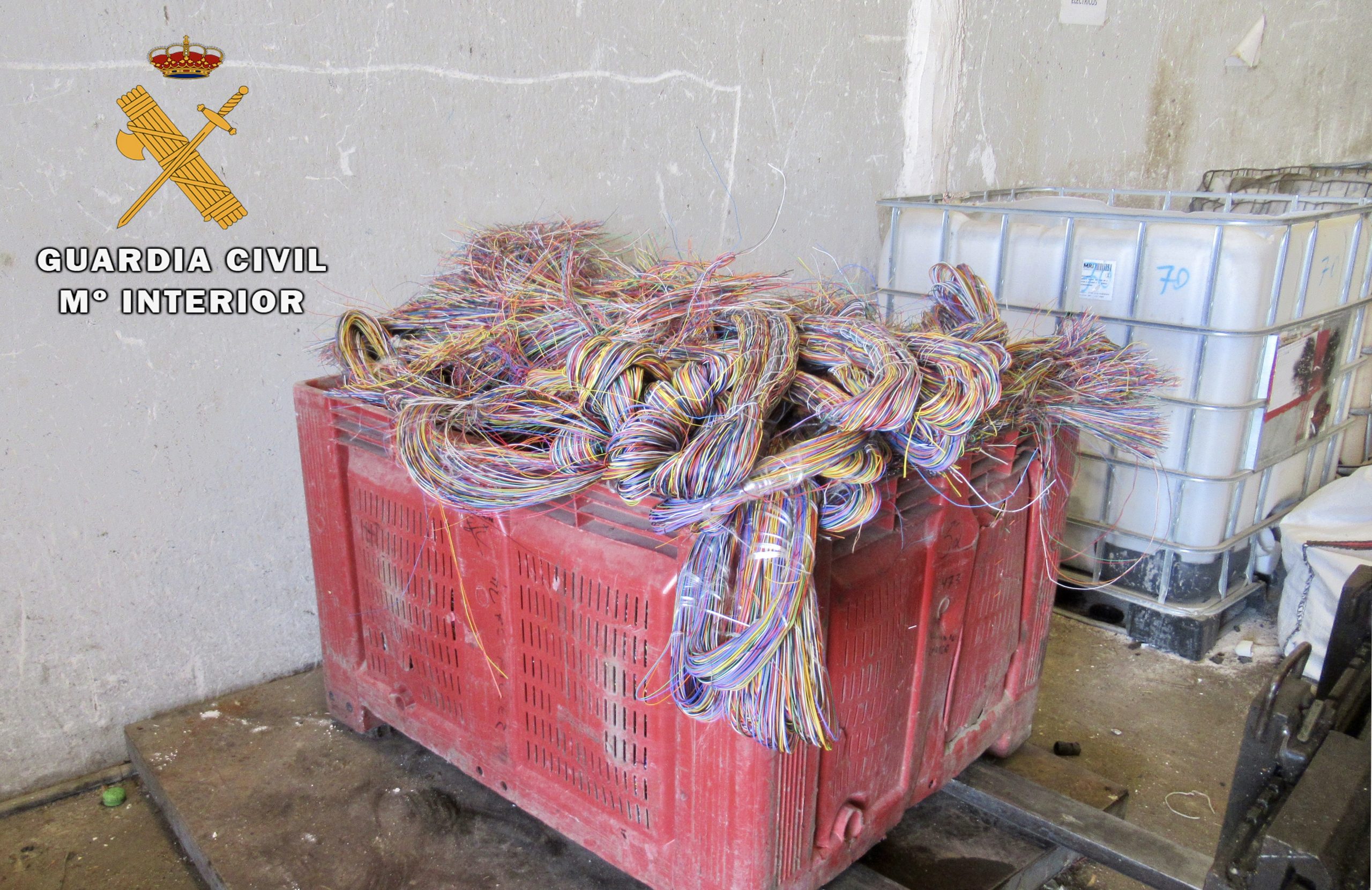 Aparte de las herramientas y otros efectos de caracterización personal, la Guardia Civil intervino, en estos almacenes, 714 kilos de cable de cobre telefónico, todavía provisto de su recubrimiento plástico, así como otros 346 kilos de cable similar, ya tratado y listo para su venta ilícita.