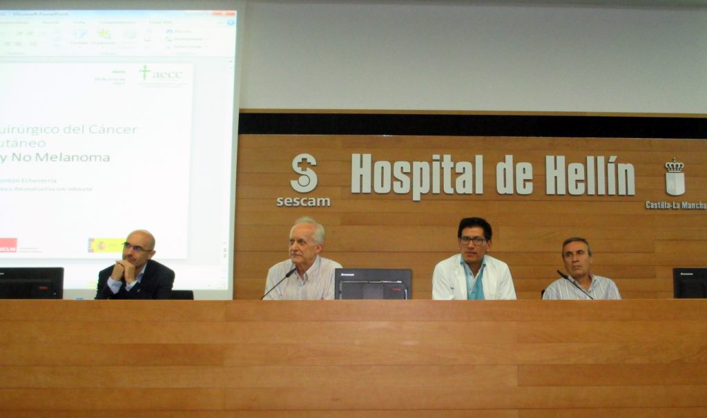 El oncólogo de este mismo centro, Alberto Aliaga, pasó a disertar sobre “El tratamiento médico de la melanoma metastásica”, cerrando el acto, Javier Móntón, cirujano del Servicio de Cirugía Plástica del Hospital General de Albacete, hablando sobre los tratamientos quirúrgicos del cáncer cutáneo.