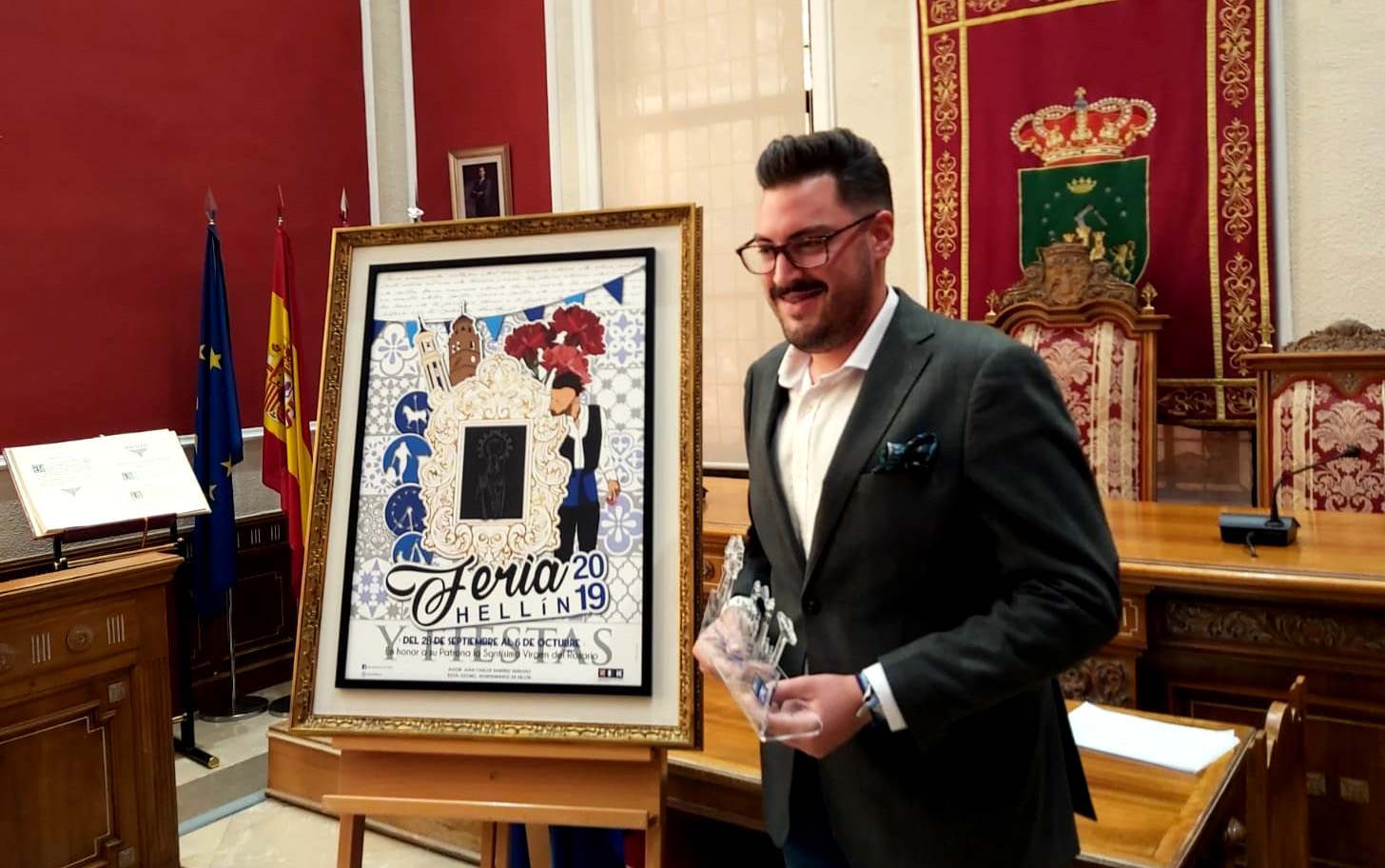 A primeras horas de la tarde de hoy se llevó a cabo otra nueva presentación del cartel anunciador de la Feria 2019, obra este año del pintor local, Juan Carlos Ramírez, acto que se realizó en el salón de actos de la casa Consistorial, por el autor al que acompañaban el alcalde de la ciudad, Ramón García, la concejala de Festejos, Fabiola Jiménez, otros miembros del Concejo y los recién elegidos Hellíneros de Honor, infantiles y adultos, que dieron un ambiente distinto y sobre todo juvenil, a este salón de actos.